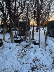 From our trips Bachman’s Wholesale Nursery Lakevile MN) we secured various hardwood (31), evergreen (3), apples (9), pears(2) plums (1) and 75 perrinials/shrubs. Most of the hardwood are 2-3″ B&B and large container (15-25 gal pots). They are bedded in for the winter.